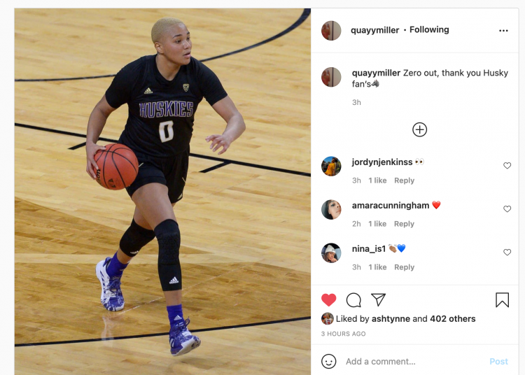 On Monday, March 29th, the first repercussions from the firing of Jody Wynn hit as a key part of the Women’s Basketball program — Huskies 6’3″ center Quay Miller, a Jody Wynn recruit -– signaled that she is transferring from the University of Washington with an instagram post, stating: