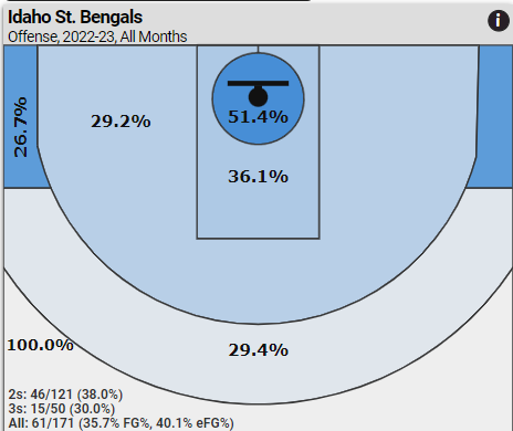 By far, Idaho State does most of its scoring inside the paint, hitting 51.14% of their shots within 4.5 feet of the rim (19 for 37) and 36.1% of their shots in the lane farther than 4.5 feet (13 for 36).