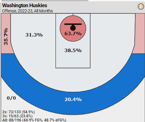 Deep diving further, the Huskies next highest shooting percentage is inside the lane farther than 4.5 feet (38.5%), followed by corner three-pointers (35.7%); mid-range shots outside the lane (31.3%); and finally, Washington only shoots 20.4% from three-point range straightaway/above the break.