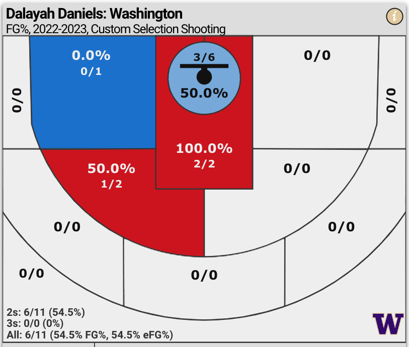 Daniels shot 50% at the rim within 4.5 feet (3 for 6) and 100% in the lane (2 for 2) and 50% on midrange shots outside the lane (1 for 2).