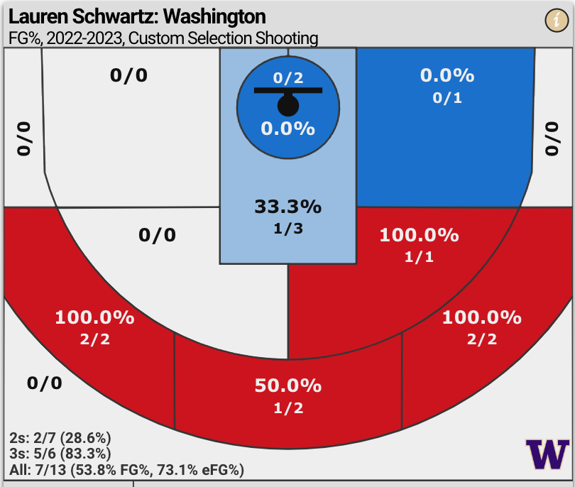 Lauren Schwartz scored 21 points on 53.8% shooting overall — 83.3% shooting from three-point range (5 for 6) and 28.6% on two-pointers in 34 minutes.