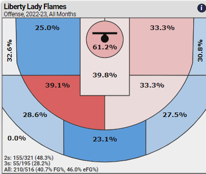 Besides being a low scoring team, the Liberty Flames do not have a highly efficient offense — they shoot 48.3% on two-pointers (mostly in the lane) and only 28.2% from three-point range.