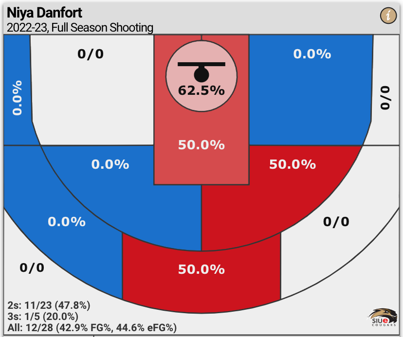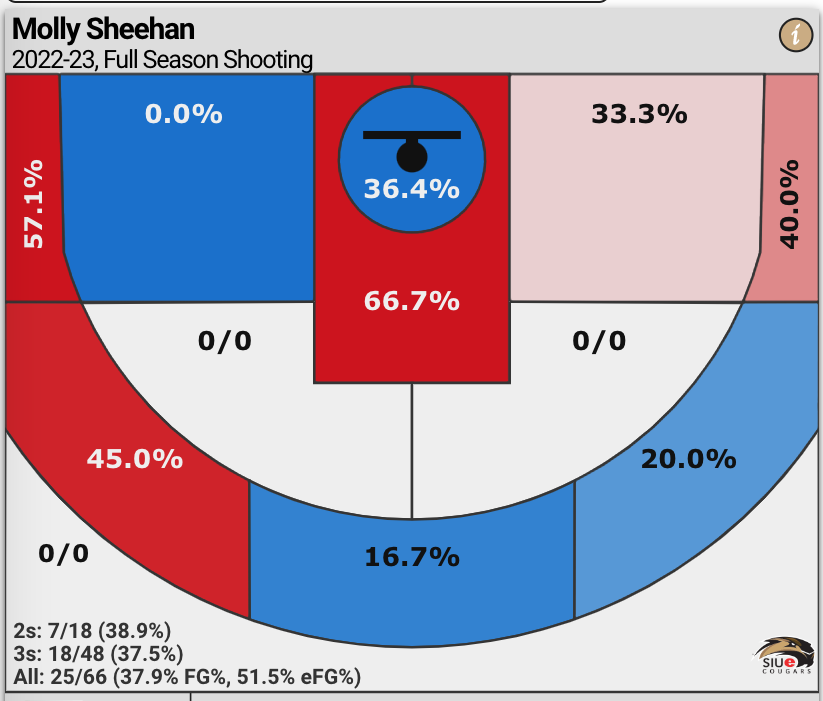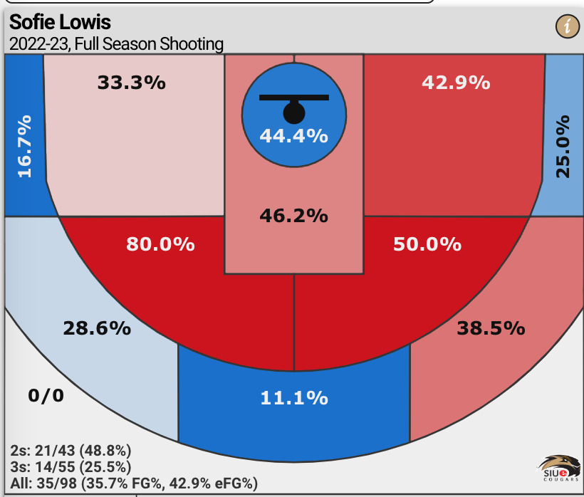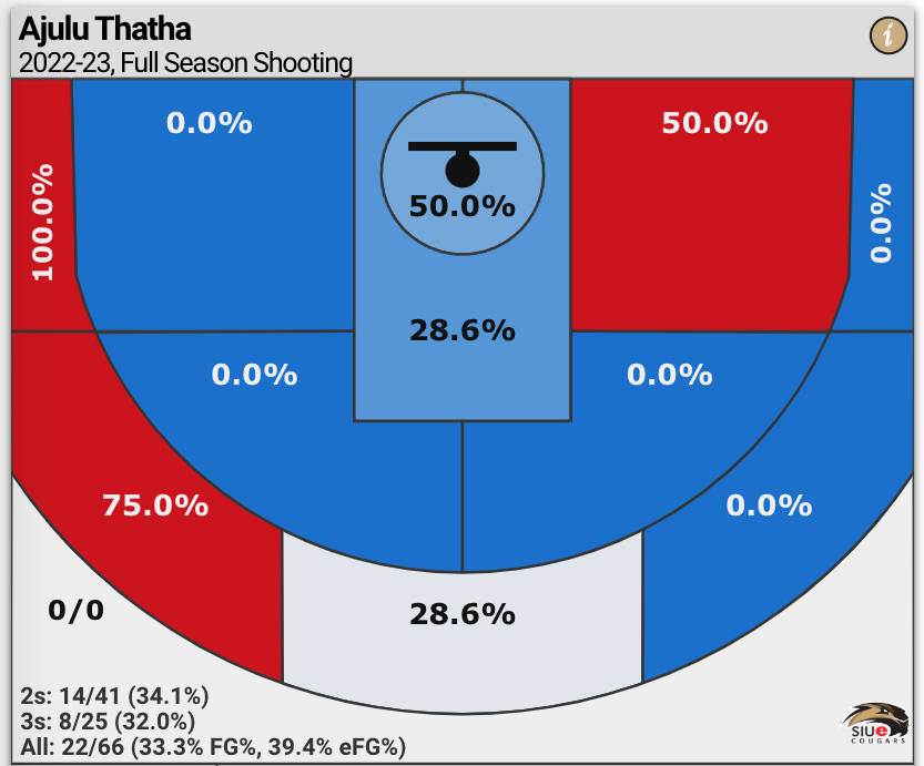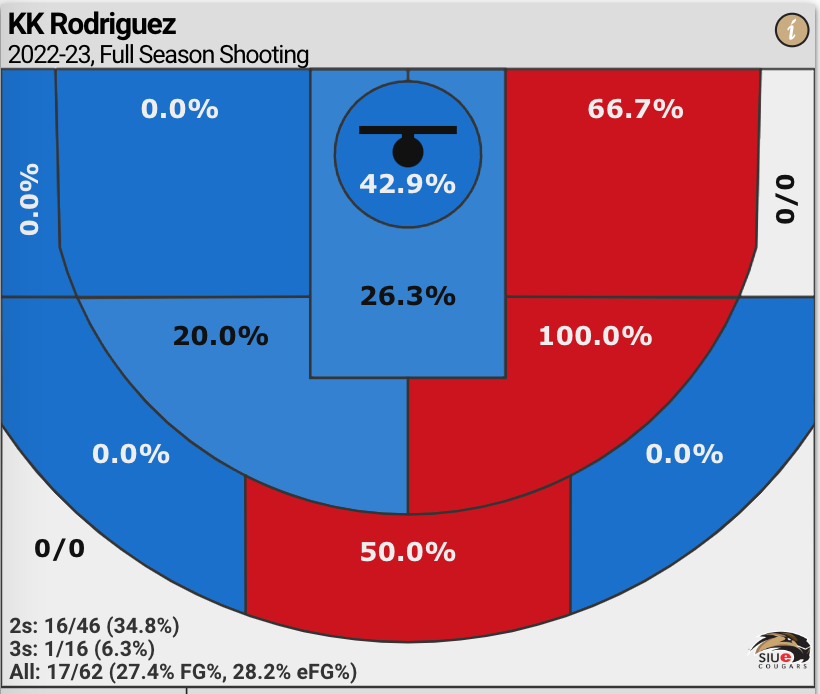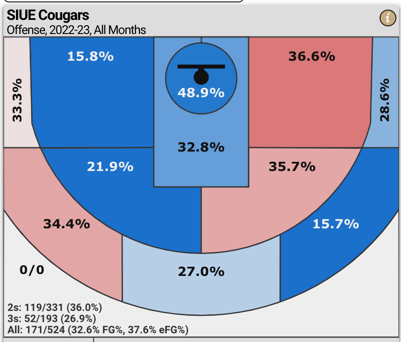 Besides being a low scoring team, the SIUE Cougars do not have a highly efficient offense, shooting 32% overall from the field — 36.0% on two-pointers (mostly in the lane) and only 26.9% from three-point range.