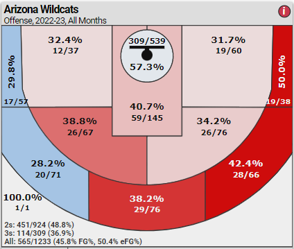 Arizona’s starting five (individually previewed, below) demonstrates above average effectiveness from all areas of the court — except left-side three-pointers.