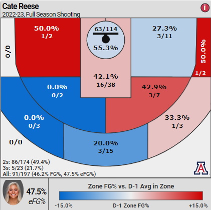 On offense, Cate Reese “eats” in the paint, 77.2% of her shots are within the paint — 57.9% of her shot attempts are at the rim (within 4.5 feet of the basket), where she averages six points per game (Top 3% in the nation).