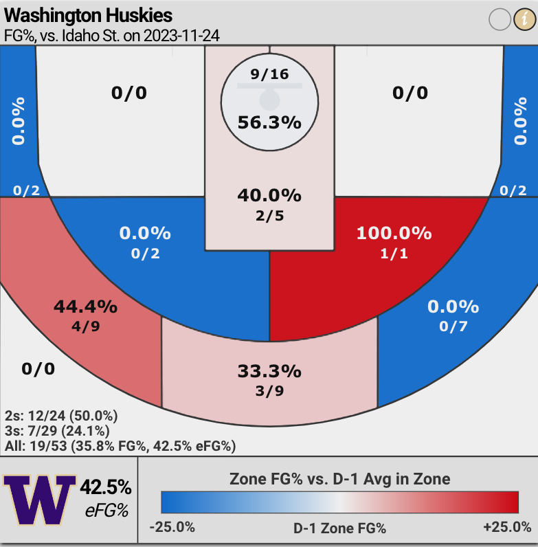 For the game, the Huskies shot 50% from two-point range, but had a poor shooting night from three-point range, shooting 24% (7 for 29).