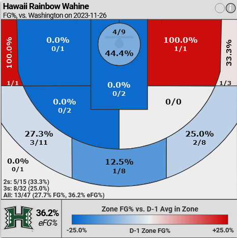 Washington’s three-point defense was lacking as most of Hawaii’s offense came from beyond the arc (8 for 13)– 32 of Hawaii’s 47 total shot attempts came from three-point range.