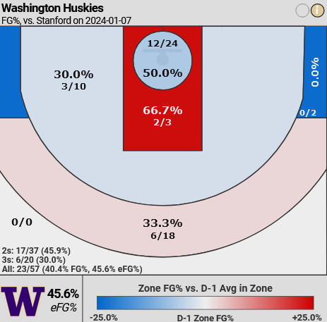 However, Stanford exploited the Washington defense inside with mutiple layups and shots in the lane area, scoring 28 total points-in-the-paint ( most coming in the first two quarters of the game).