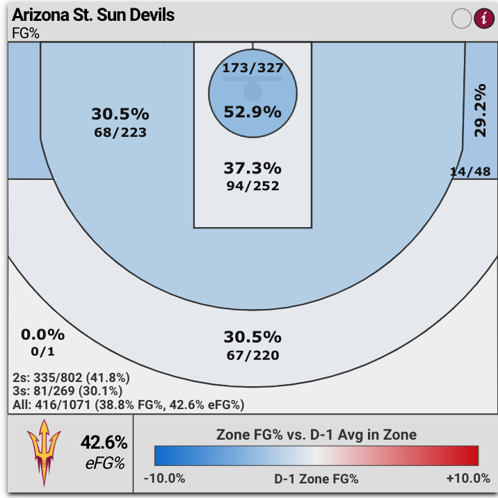 Arizona State is a below average three-point shooting team at 30.1% accuracy from beyond the arc.