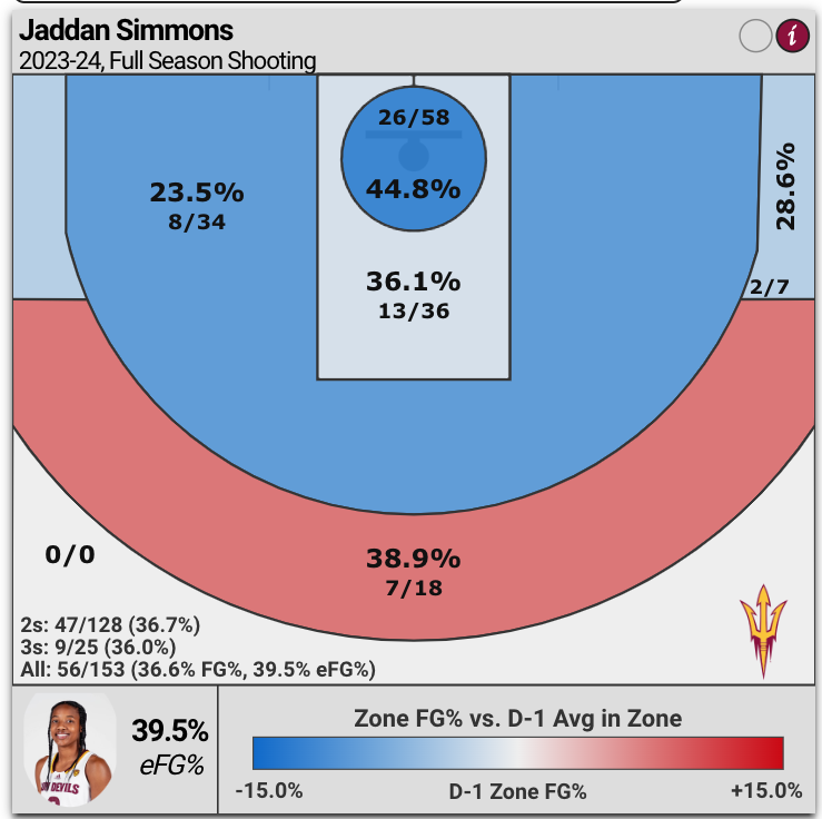 Simmons only scores at 44.8% (48 for 78) efficiency within 4.5 feet of the rim; and is even less efficient from farther out in the lane at 36.1% (13 for 36).