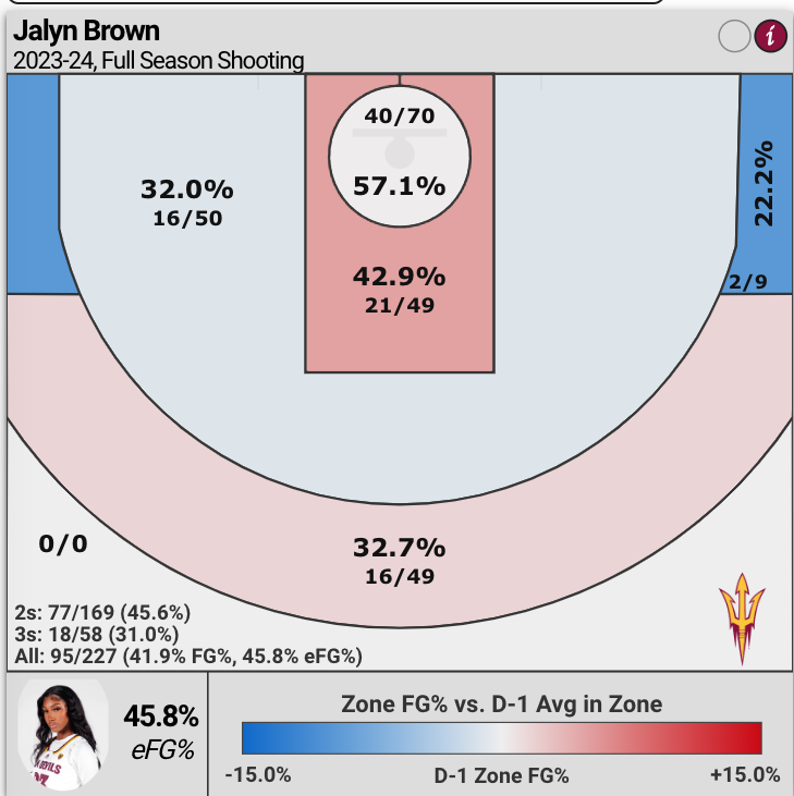 Brown is most effective at attacking the rim — she makes 57.1% (40 of 70) of her shots within 4.5 feet of the rim (her efficiency drops to 42.9% from further out in the lane).