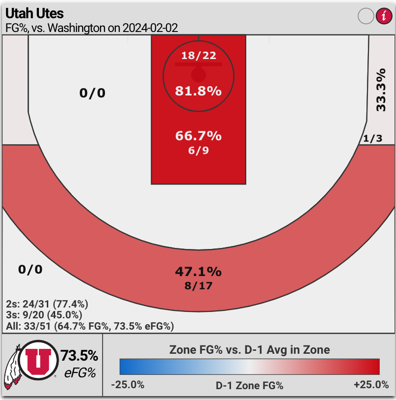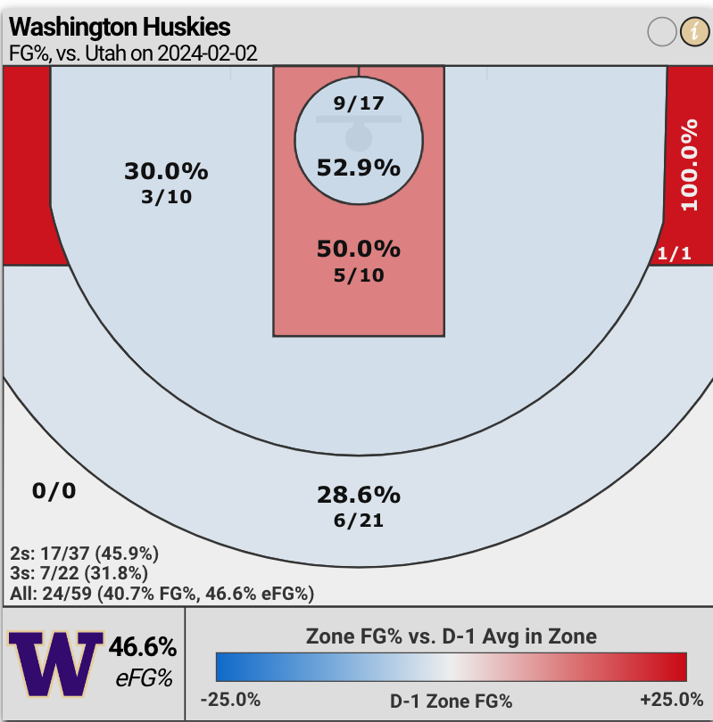 Although, the Huskies actually committed less turnovers than the Utes (8 UW turnovers versus Utah’s 15); scored more points off turnovers (22 points by UW versus 10 points by Utah); and Huskies defenders forced 10 steals versus three steals by the Utes — the efficiency of Utah’s offense was overwhelming.