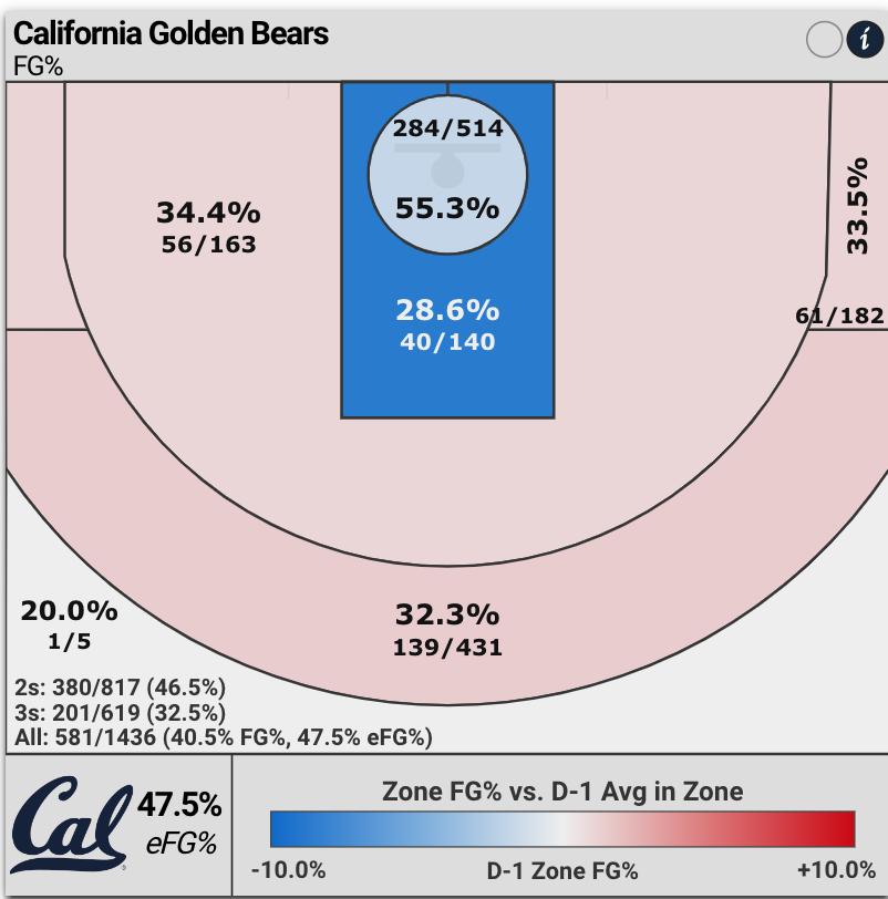Overall, California is an average three-point shooting team at 32.5% accuracy from beyond the arc.