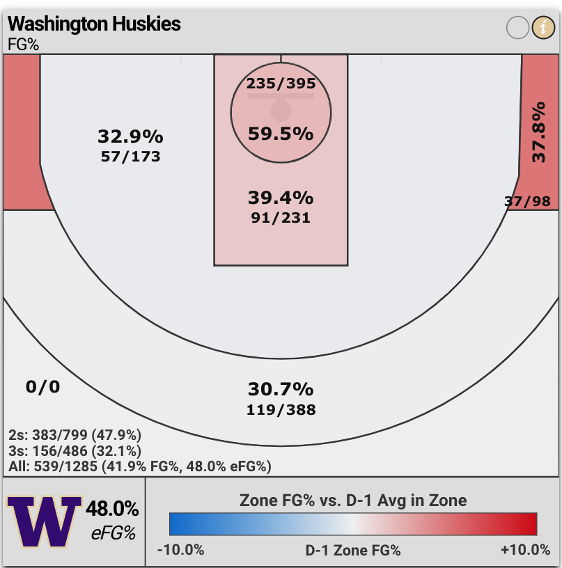 Defensively, Washington defenders are holding opponents to only 28.6% shooting from three-point range.