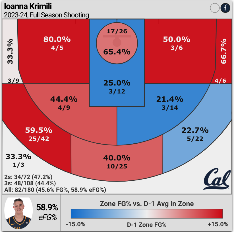 Krimili shoots an impressive 65.4% at the rim (within 4.5 feet).