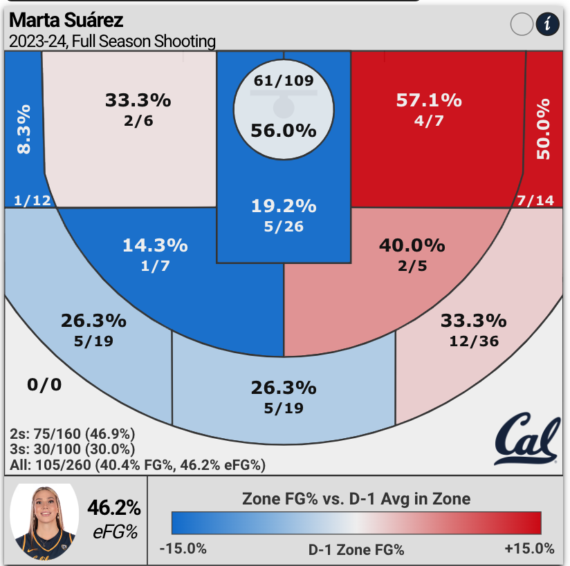 Despite her size, Marta Suárez is not as efficient shooting inside-the-lane as one would expect, but still manages to score 46.3% of her points in-the-paint.