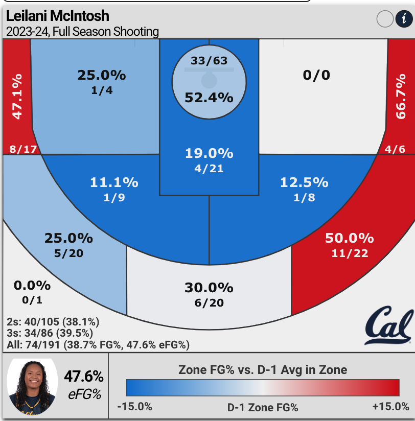 Finally, McIntosh is very active in transition — scoring 17.7% of her points from Cal’s fastbreak offense.