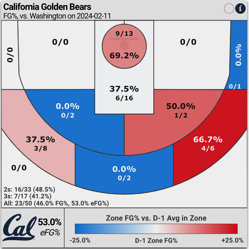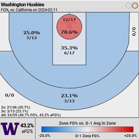 California’s offense exploited the Huskies on wing threes (37.% left wing/ 66.7% right wing) and at-the-rim (69.2% within 4.5 feet).