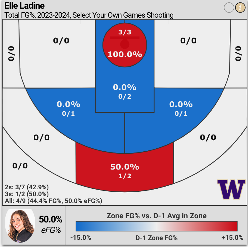UW was most effective scoring inside, 70.6%, at the rim (within 4.5 feet), but only shot 35.3% from farther out in the lane (6 for 17).