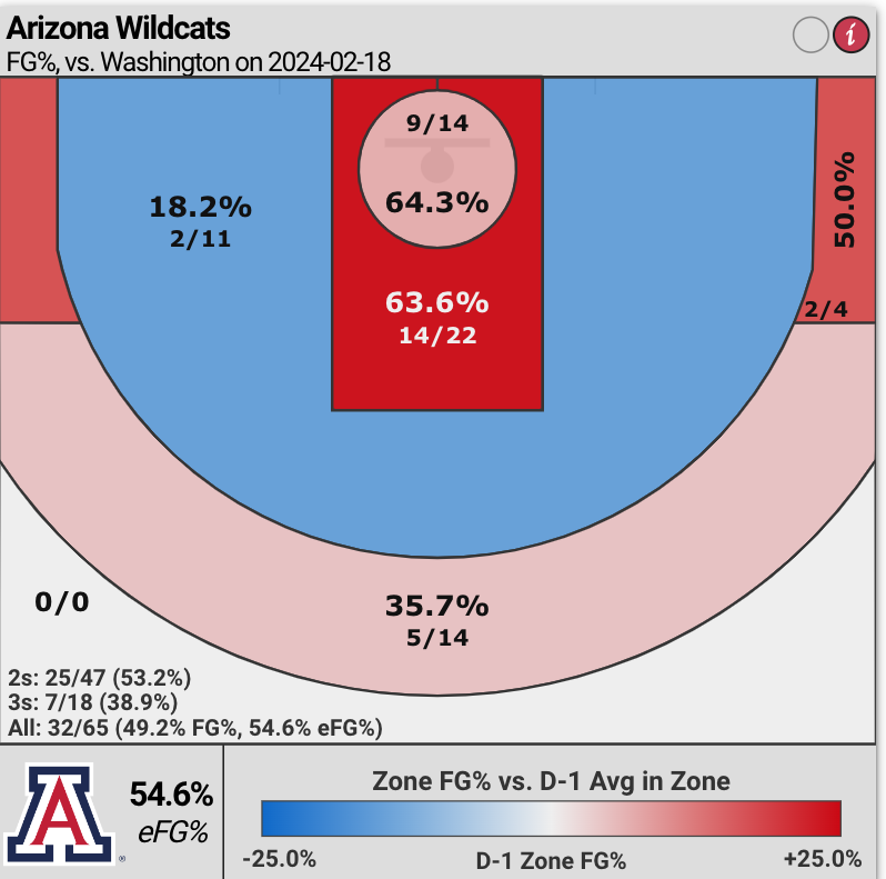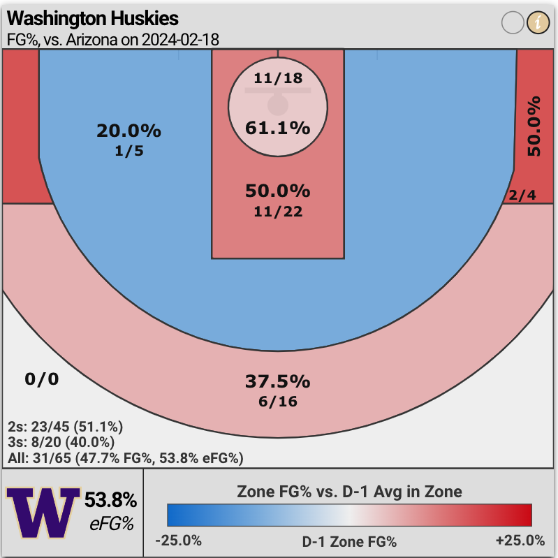 Arizona shot 47.1% overall and 60% from three-point range; meanwhile UW shot 23.1% overall and 0% from three-point range.