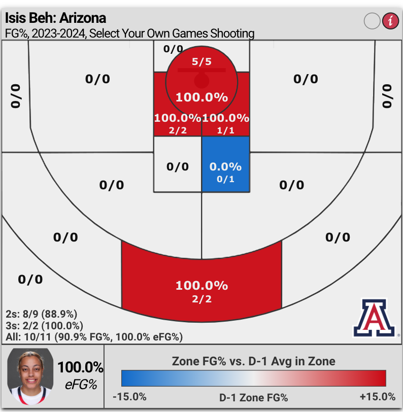 Particularly, Arizona’s Isis Beh was mostly unbothered by Huskies defenders, scoring a career high 29 points in 39 minutes on 90.9% shooting (10-of-11), including 88.9% (5 for 6) on two-pointers overall; 100% at the rim; and 100% from three-point range (2 for 2).