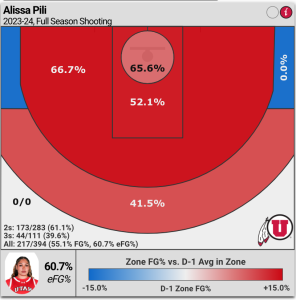 Pili is an offensive threat from all three levels — 55.1% shooting overall, 81.8% from the free throw line (so fouling her does not stop her) and shooting 61.1.% for two-pointers and 39.6% from three-point range.