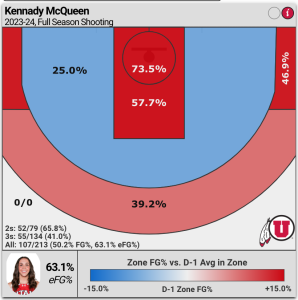 McQueen is an inside-outside offensive threat for the Utes that is dangerous from anywhere on the court — i.e., a scorching 41% accuracy from three-point range; 65.8% on two-pointers, 73.5% at the rim (within 4.5 feet) and 57.7% from further out in the lane.