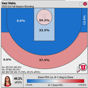 Ines Vieira is a 5′ 6″ Junior guard and the Utes fifth-leading scorer (tied) at 7.9 points per game; along with 6.0 assists per game, 3.8 rebounds, and 2.6 steals.