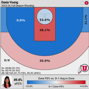 Young is most adept at scoring inside the lane but she takes almost an equal number of two-point attempts (84) as three-point attempts (79) — she is an average three-point shooter except on straightaway threes (35%).