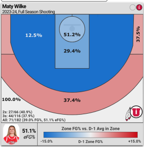 Matty Wilke is primarily a three-point threat (37.9% accuracy) but not much of a scoring threat from anywhere else on the court.