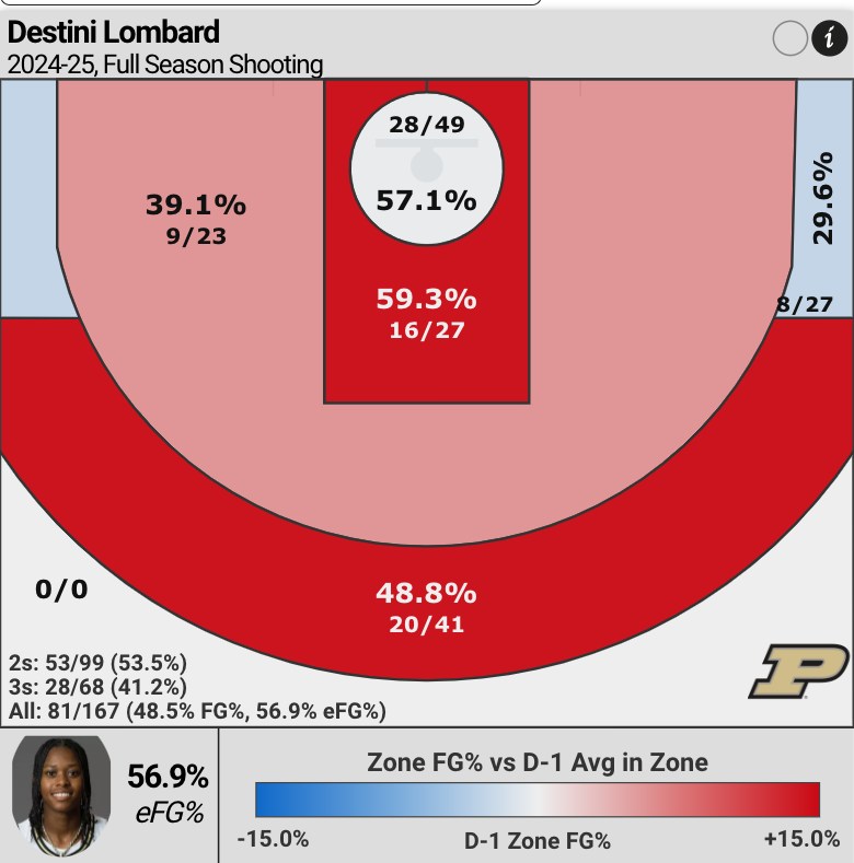 Lombard also excels scoring in in-the-paint: making 57.1% of shots at the rim (within 4.5 feet); and 59.3% from further away in the lane.