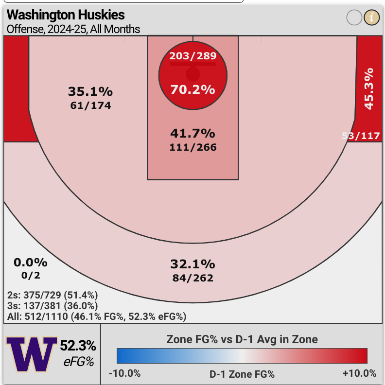 The Huskies are now shooting 36% from three-point range (45% on corner threes).