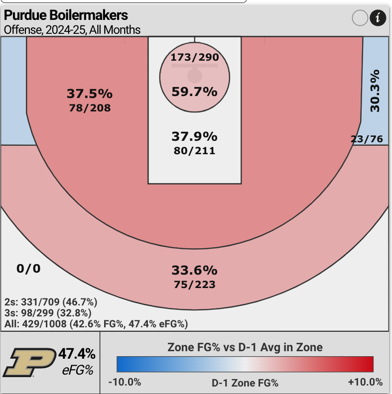 The Boilermakers are mediocre shooting (37.9%; 80 for 211) from further away inside-the-paint (5 feet or more).