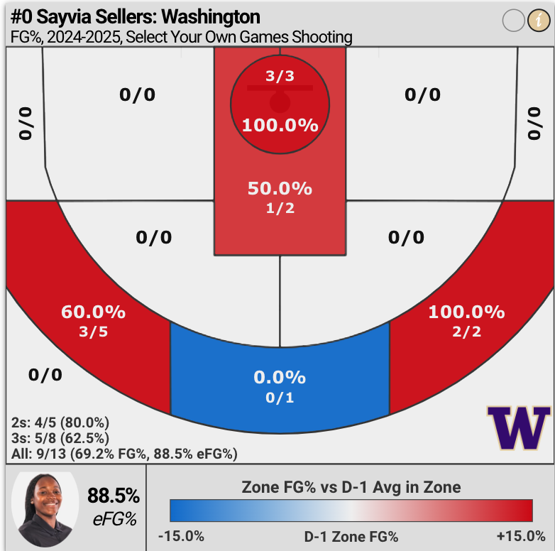 In 32 minutes of playing time, Sayviah Sellers led the Huskies with 24 points by shooting 69.2% from the field overall (9-13); and 62.5% from three-point range (5 for 8).