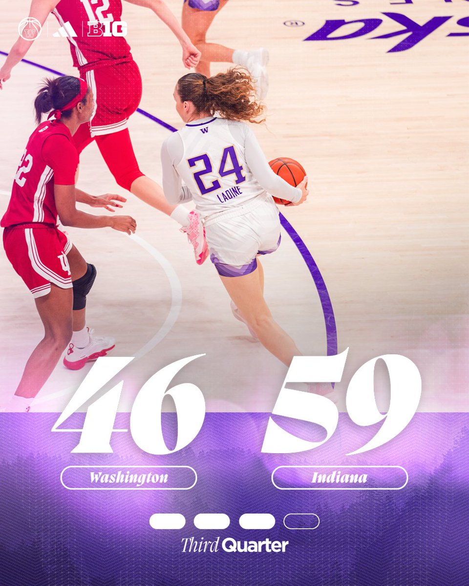 The Hoosiers ended the third period with a 7-0 scoring run as the Huskies fell behind by 13 points heading into the final period, 46-59.