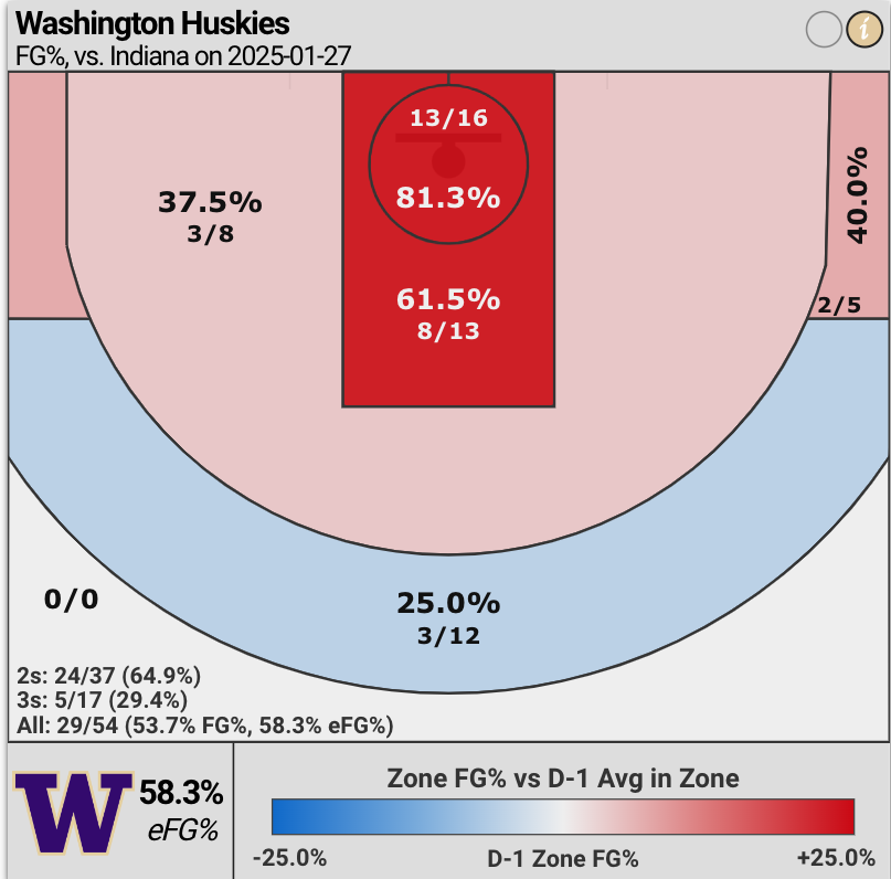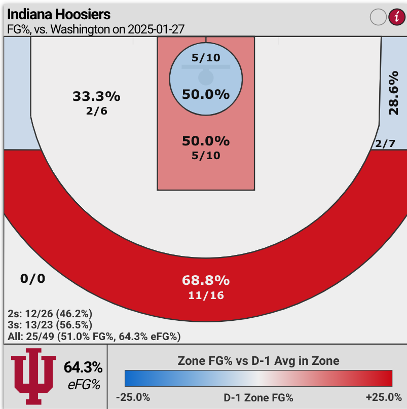 For most of the night, the Washington defenders put up very little resistance to a Indiana Hoosiers offense that shot 56.5% from three-point range; while shooting 51% (33 for 46) overall; as well as 64.9% on two-point attempts.
