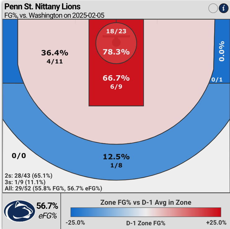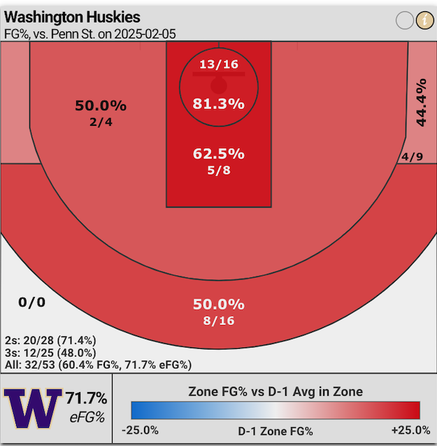 However, Washington’s three-point defense put the clamps on the Nittany Lions from three-point range: i.e., Penn State shot only 11% from deep (1 for 8).