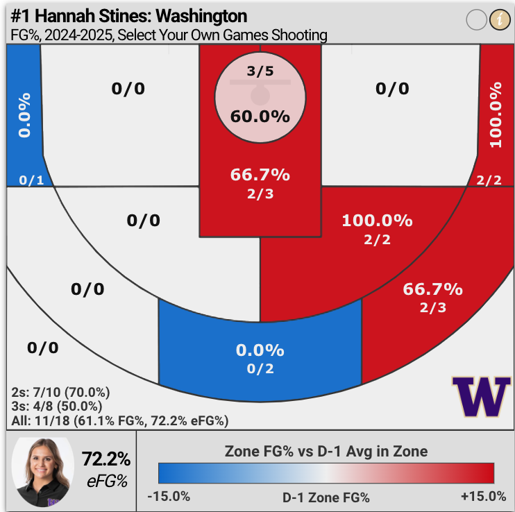 Hannah Stines led the Huskies with 28 points on 61% (11 for 18) shooting overall; and 50% efficiency from three-point range (3 for 6).