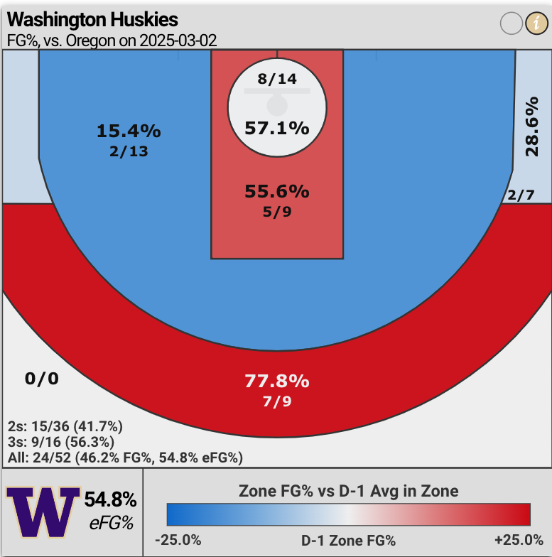 Meanwhile, the Huskies offense shot 46.2% overall; a scorching 56.3% shooting from three-point range (9 for 16); only 15.4% from mid-range; and only 57.1% shooting at-the-rim.