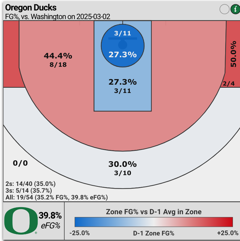 Meanwhile, Oregon shot only 25% (3 for 12) overall and 0% from three-point range (0 for 1).