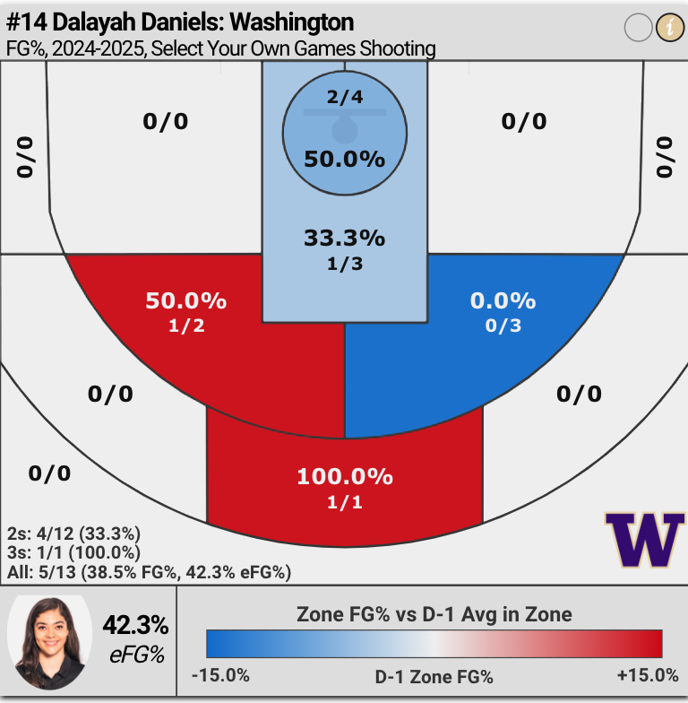 The Huskies shot 42.9% (6 for 14) overall; and 60% from three-point range (3 for 5).