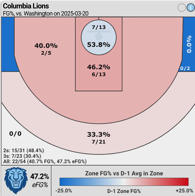Meanwhile, Columbia made seven three-pointers (30.4% shooting; 7 of 23 attempts).