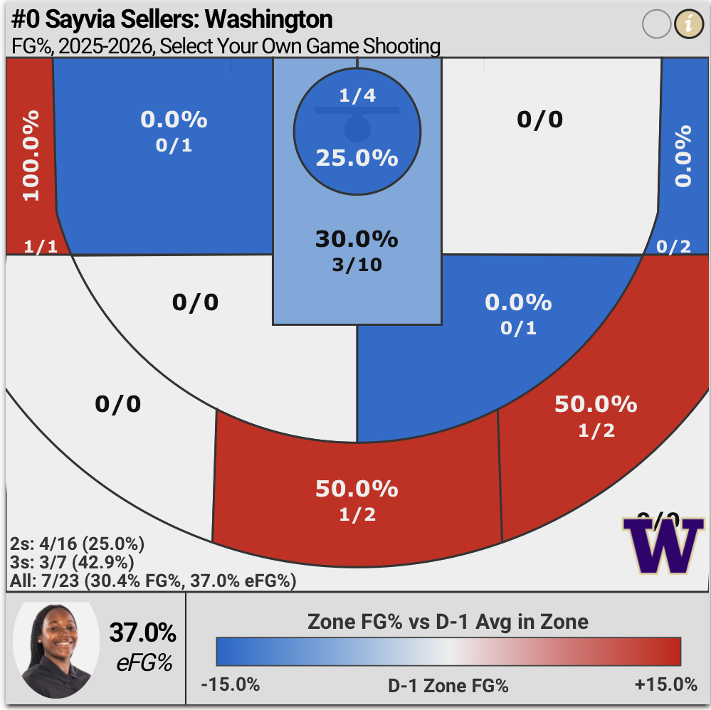 Sellers scored 20 points in 36 minutes on 30.4% (7 for 23) shooting overall; and 42.9% efficiency from three-point range (3 for 7), including 10 points in the second quarter (of the Huskies 14 points total).