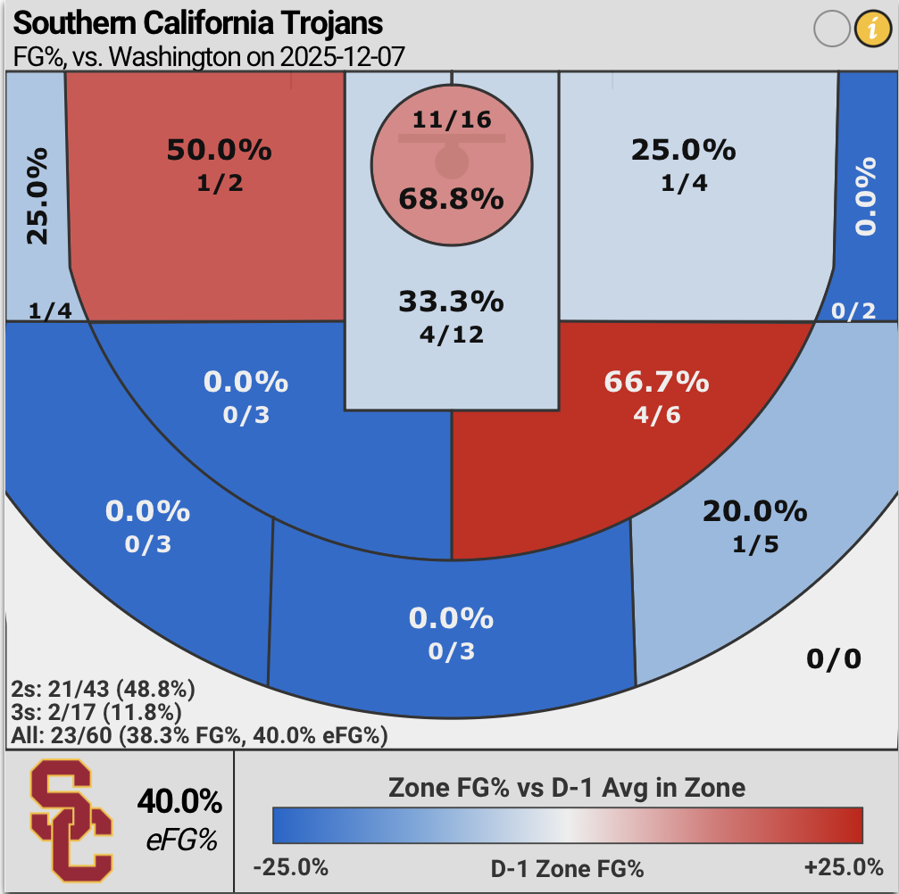 Although USC shot a much improved 43.8% shooting overall (7 for 16); they went scoreless from deep, i.e., 0% shooting from three-point range (0 for 4).
