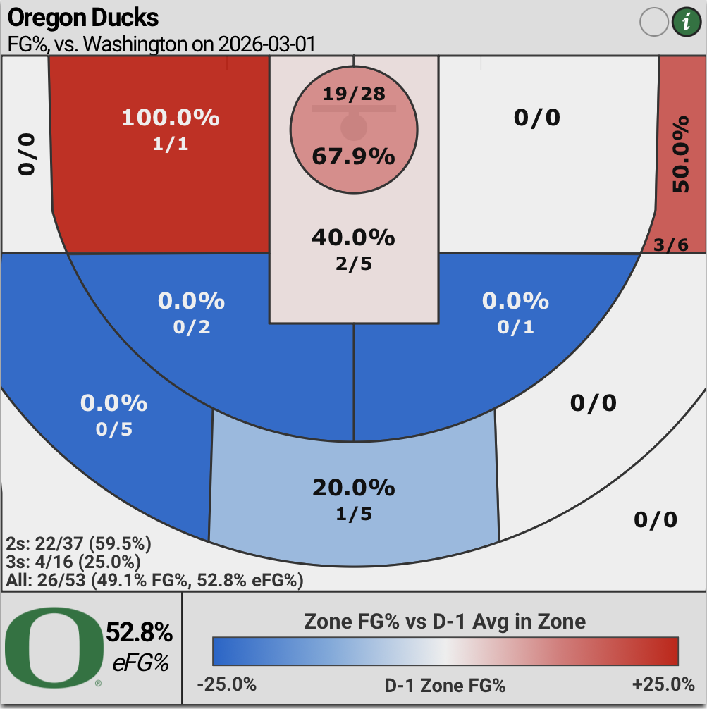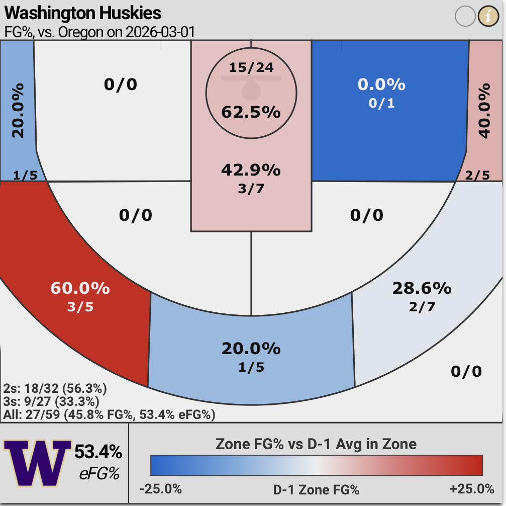 UW finished with 13 assists to Oregon’s 1 assist, underscoring how much crisper and connected Washington’s offense was compared to the Ducks’ more isolation-heavy style.