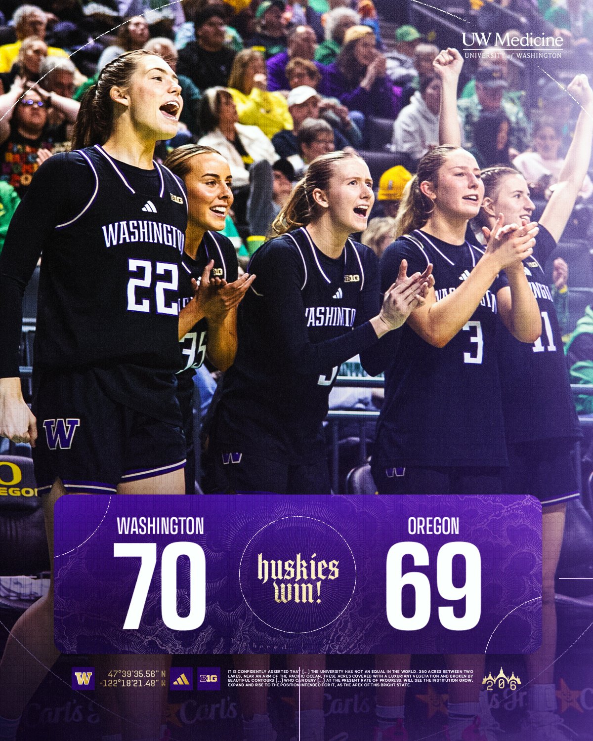 Coppinger made one of two free throws giving UW 70-69 lead with five seconds left. Oregon’s last gasp came up empty, and the Huskies secured the one-point road victory.