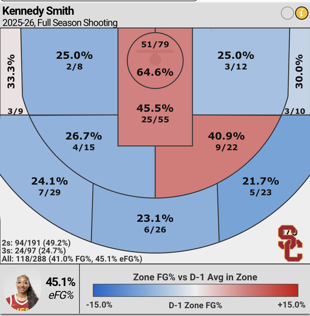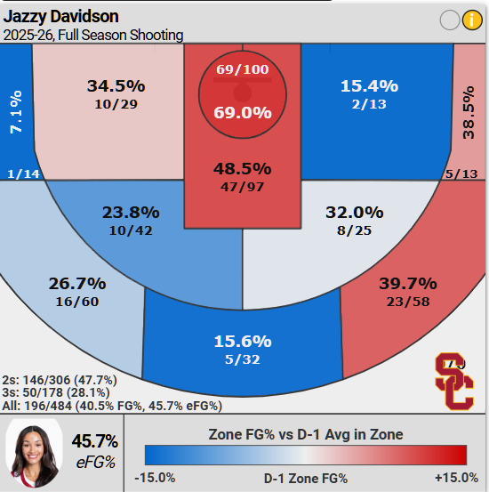Davidson’s one glaring weakness is she is not an efficient three-point shooter (28.1%), but she makes big shots consistently and her versatility makes her the most impactful Trojan player on the floor, at all times.
