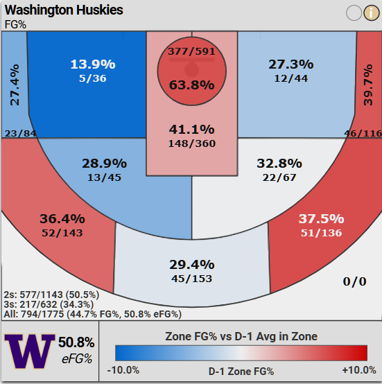Offensively the Huskies shoot a modest 44.7% overall; but an encouraging 50.5% on all two-point attempts; an efficient 63.8% at the rim; as well as a respectable 34.3% from three-point range.