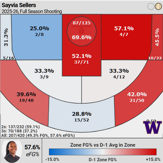 Washington’s 5’7″ junior point guard Sayvia Sellers is the offensive engine who averages 19.2 points on 59.1% shooting on all two-point attempts and 37.2% from beyond the arc; while dishing out 3.6 assists per game.