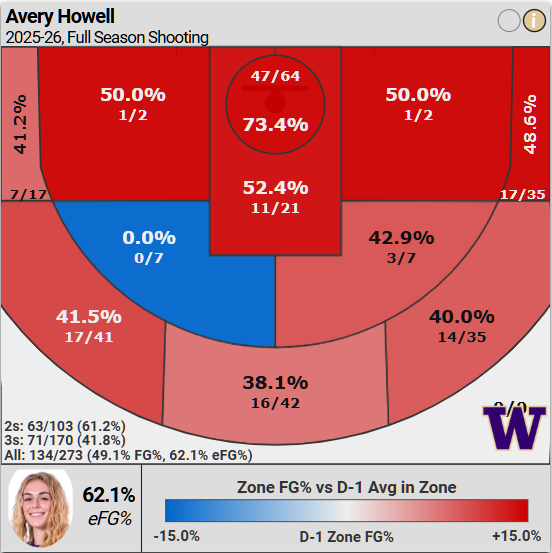 Next to Sellers, 6’0 sophomore. wing-guard Avery Howell is averaging 13.4 points on 49.1% shooting from the field; 61.2% on all two-point attempts; an elite 41.8% from the three-point line; as well as an elite 73.4% efficiency at the rim.